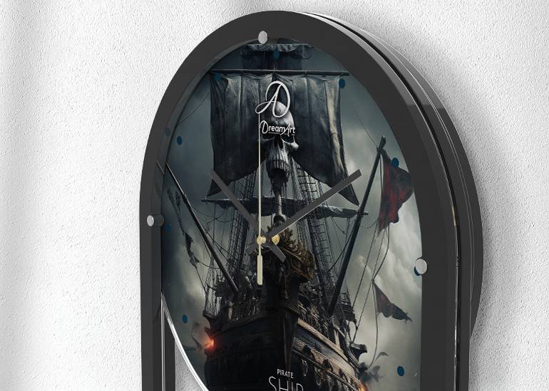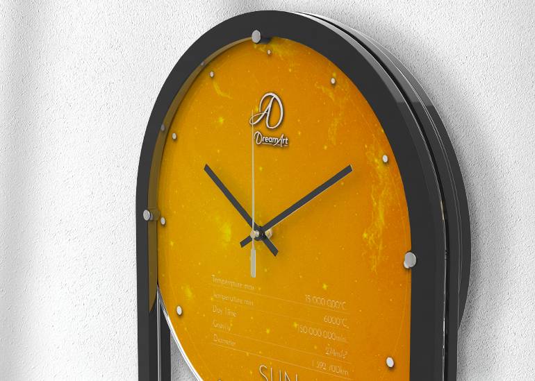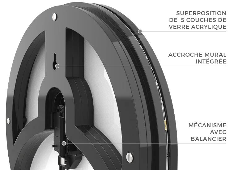 Pendule composé de 5 couches verre acrylique de haute qualité, d'un cadran et d'un balancier avec décors imprimés.