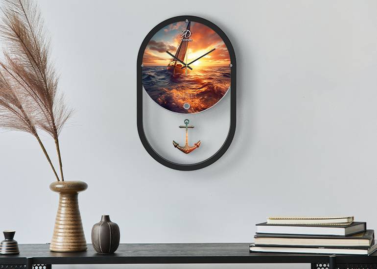 Pendule en verre acrylique de haute qualité avec cadran et balancier avec décors imprimés.