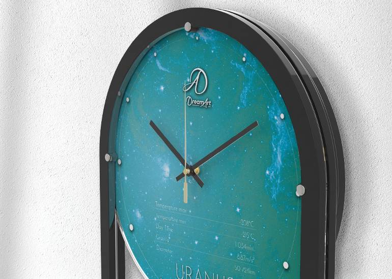 Horloge est composée de deux couches de verre acrylique, une imprimée et personnalisable, l'autre est noir ou blanche.