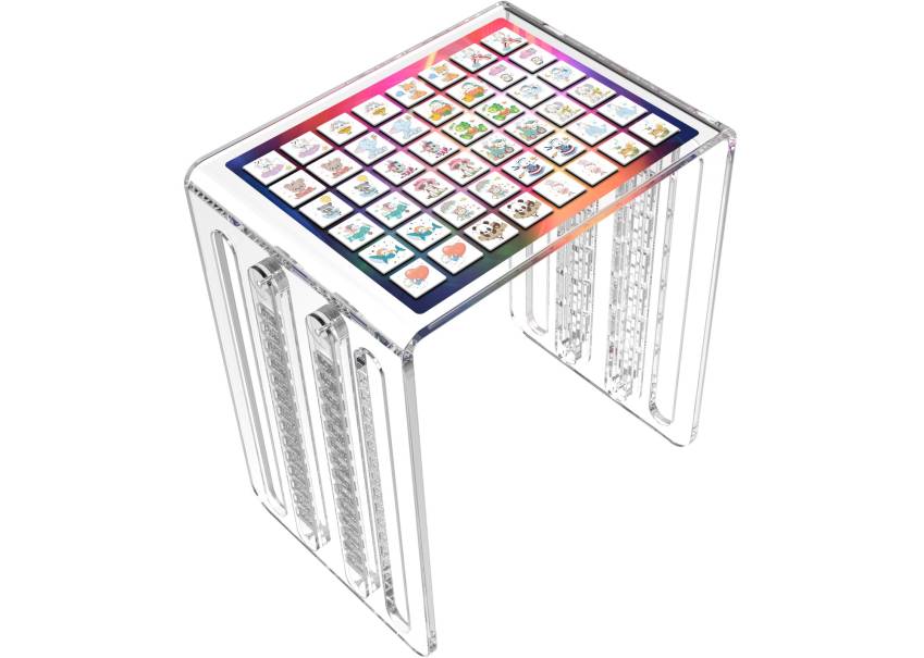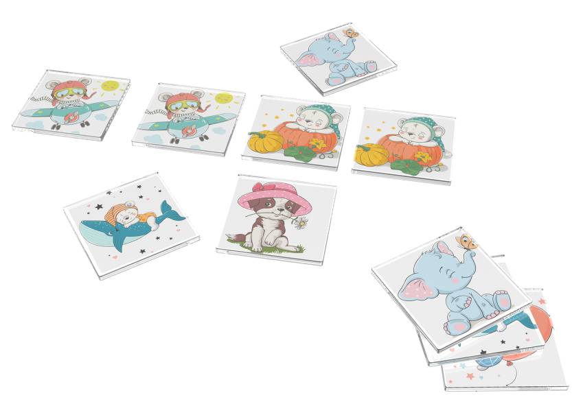 Elle est composée d'un jeu de 24 paires de cartes Memory sur le thème de l'enfance et d'un ensemble de dominos qui sont aussi en verre acrylique imprimé. Ils peuvent être discrètement rangées sur les cotés.Ainsi le meuble reste sobre pour ne mettre en avant que l'image choisie.